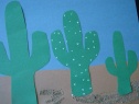 Here's how you make it... 1. Print and cut out the cactus template. Trace onto green paper and cut out. 2. Cut a strip of brown paper and glue it onto the bottom of a blue piece of construction paper. Smear some glue onto the brown part, sprinkle on some sand, then shake off the excess.