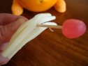 2. If you are making the orange bunny and want to attach some peanut candy bunny feet you will need to do that first. Attach each foot with a tooth pick into the bottom sides of your orange. 3. Place two jelly bean eyes in the middle of your fruit.