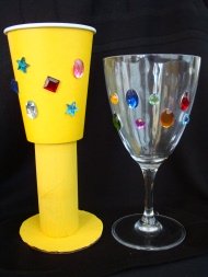 Here's how you make them... Cheap Version: 1. Glue your fake jewels all over your wine glass. Make it even more sparkly by outlining the jewels in glitter glue! This is a great take home birthday party craft, and the kids can drink out of it while they're at the party!