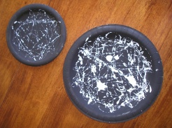 1. Paint your paper plate black (if you have a waxy finshed plate you may need to give it a couple of coats). Once your black paint has dried, drop 2 or 3 small drops of white paint on to the middle of your plate. Place your marble in the plate and roll it around. The marble will spread around your white paint making a spider web design.