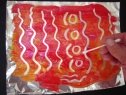 2. Cut a piece of tin foil a little smaller than the construction paper. Paint all over the foil. you can use one color or many. We used red and yellow, which made an orange where the colors ran into each other. Before the paint dries use Q tips to make a shiny design come through the paint. Slide the Q tip in the paint to make your design. You will need a few Q tips since they get filled with paint quickly and won't "erase" the paint well.