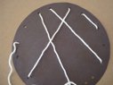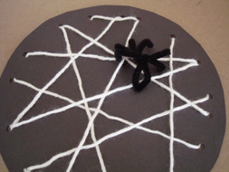 3. Thread the yarn in and out of the holes, in any direction you choose! When you are done, tape the end close to a hole. If you want to add more to your web just tape on another piece of yarn and continue threading.