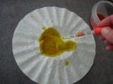 1. Place your coffee filter onto a piece of wax paper or paper bag. Fill 2 containers with 2 Tablespoons of water each, mix 10 drops of yellow food coloring in one container and 10 drops of red food coloring in the other (this amount can make 2-3 "sunsets").