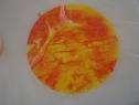2. With an eye dropper or straw drop the colored water onto the coffee filter. When the red and yellow mix it will make a nice sunset orange color. (If you're using a straw you'll need to place the straw into the water, cover the end with your finger and then drop the contents onto the filter.)